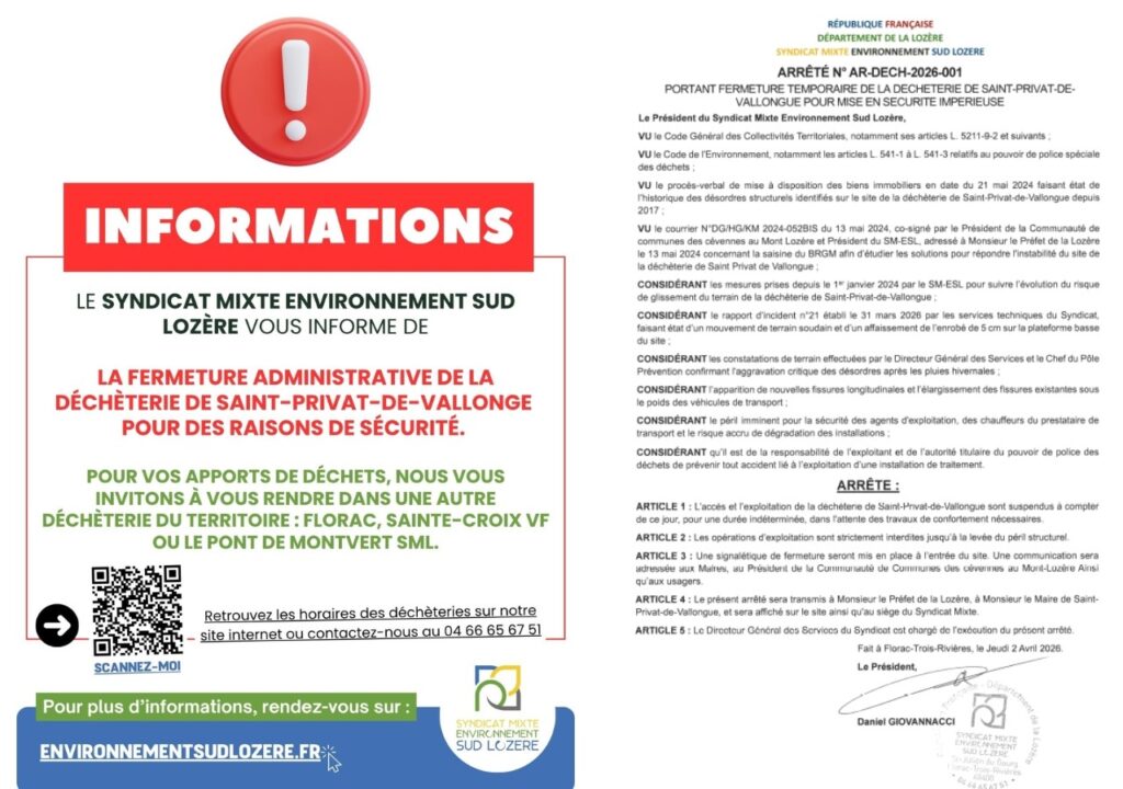 Le Syndicat Mixte Environnement Sud Lozère vous informe de la fermeture [...]