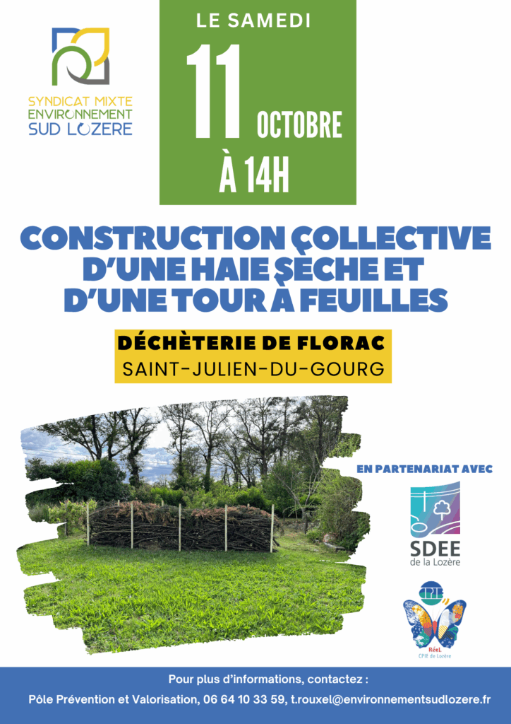 Le Syndicat Mixte Environnement Sud Lozère (SM-ESL), en partenariat avec le SDEE et le Réel 48, organise le samedi 11 octobre à 14h, un atelier de construction collective d’une haie sèche et d’une tour à feuilles.